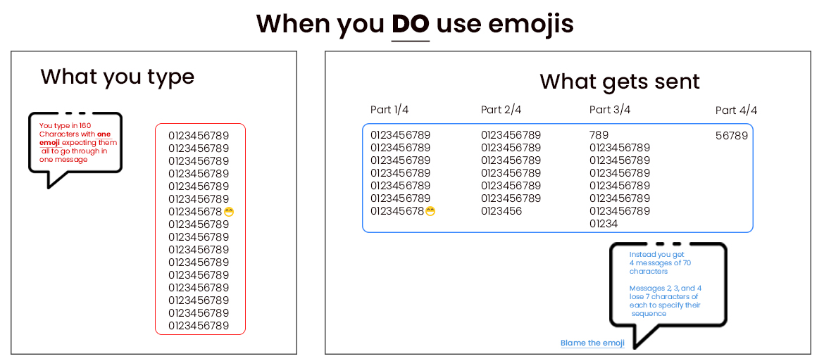 Imagine wanting to send out a 160 character plain-text message to an audience. Slipping in just one emoji would mean your messages can only have 70 instead of 160 characters. So your messages get split up into 3 messages of 70, 67, and 3 characters, and you get charged 3 times as much as you intended!