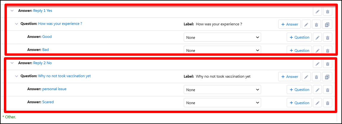 You can trigger a sequence of further nested questions and answers for each answer choice. So, for each type of answer received, a different sequence of questions may be triggered next.