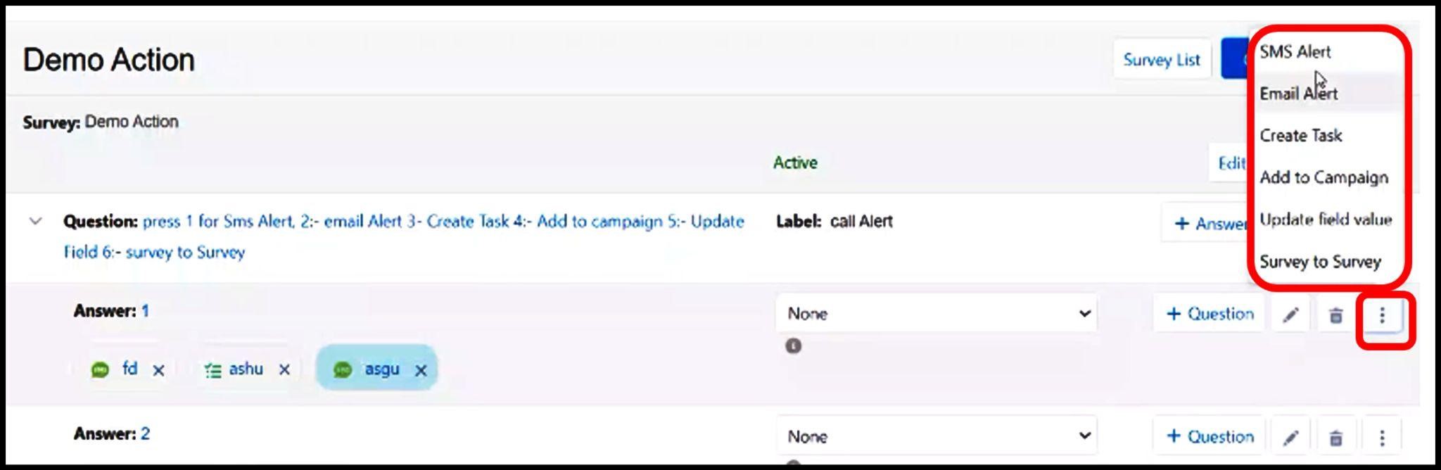 You can perform or assign actions like creating a task, updating fields, triggering emails, alerting a Salesforce user with a notification, jumping to another Survey, or adding recipients to ongoing campaigns.