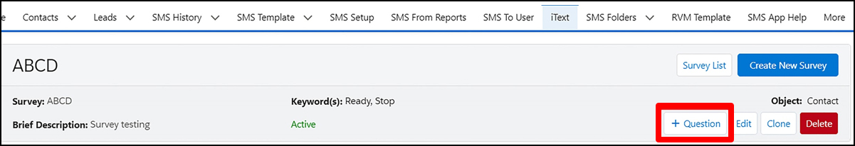 When you click Create, a Survey will be created. Now, you can add questions by clicking +Question, as shown below.