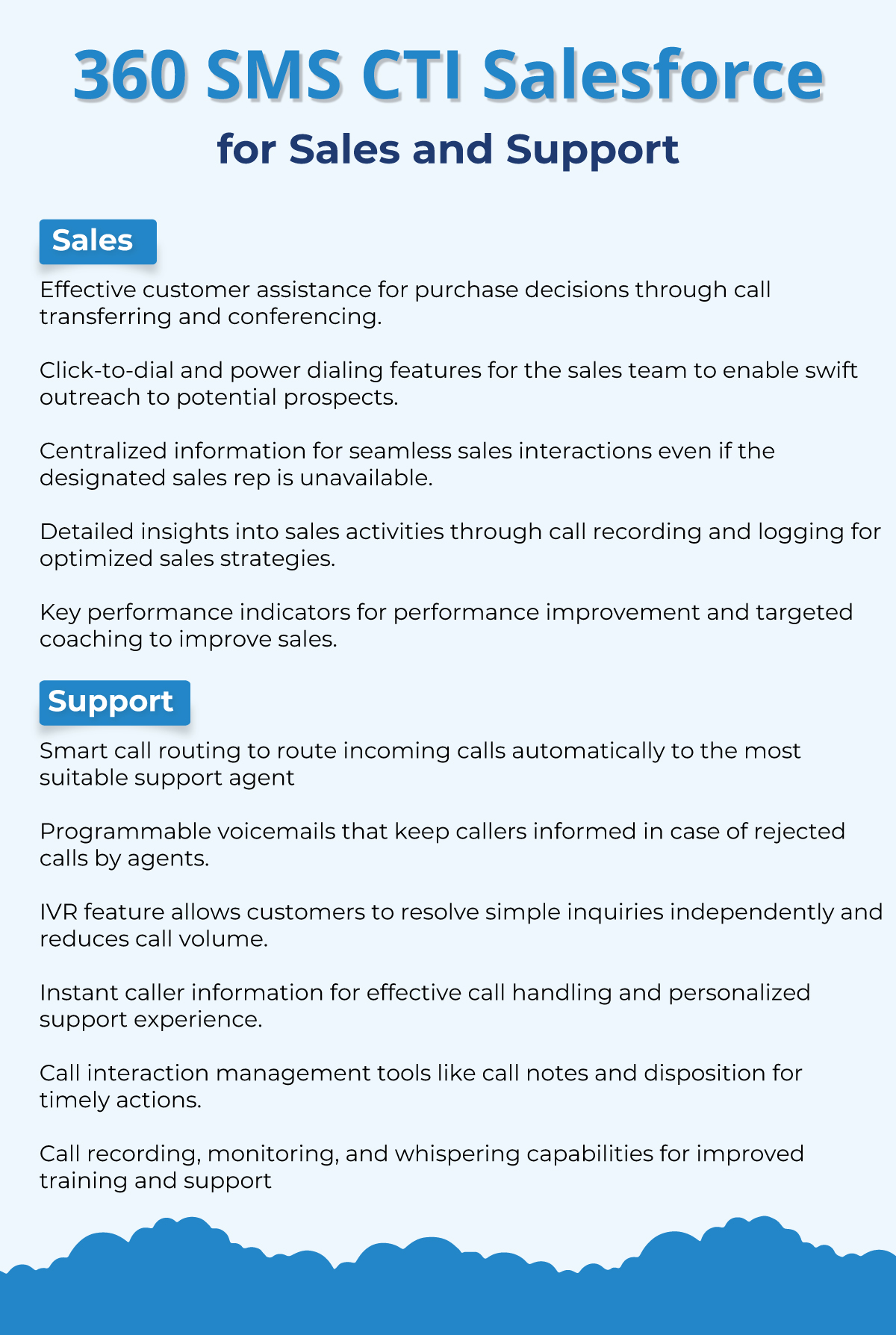 With an advanced CTI integration solution like 360 SMS, users can conveniently get advanced call management capabilities in Salesforce to increase their call interactions, on-call closures, customer satisfaction, and more.